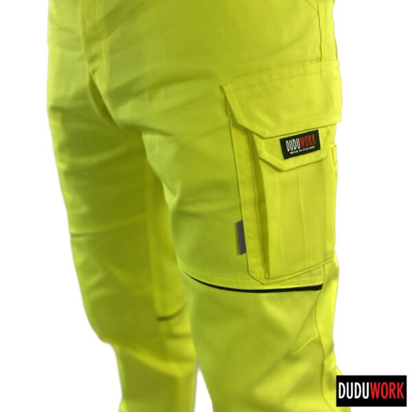 Spodnie robocze wykonane są w 100% w Polsce z wytrzymałej i odpornej na ścieranie tkaniny, o składzie 65% poliester i 35% bawełna i gramaturze 250 g/m2.
